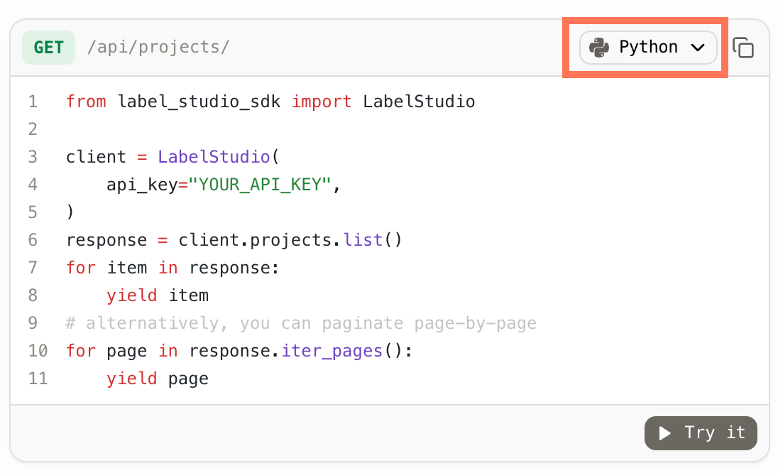 On the other hand, the Label Studio SDK, designed specifically for Python, offers a more intuitive layer over the API. It streamlines API interactions with user-friendly Python methods and classes. This simplification benefits routine tasks such as project setup, task handling, and data export.