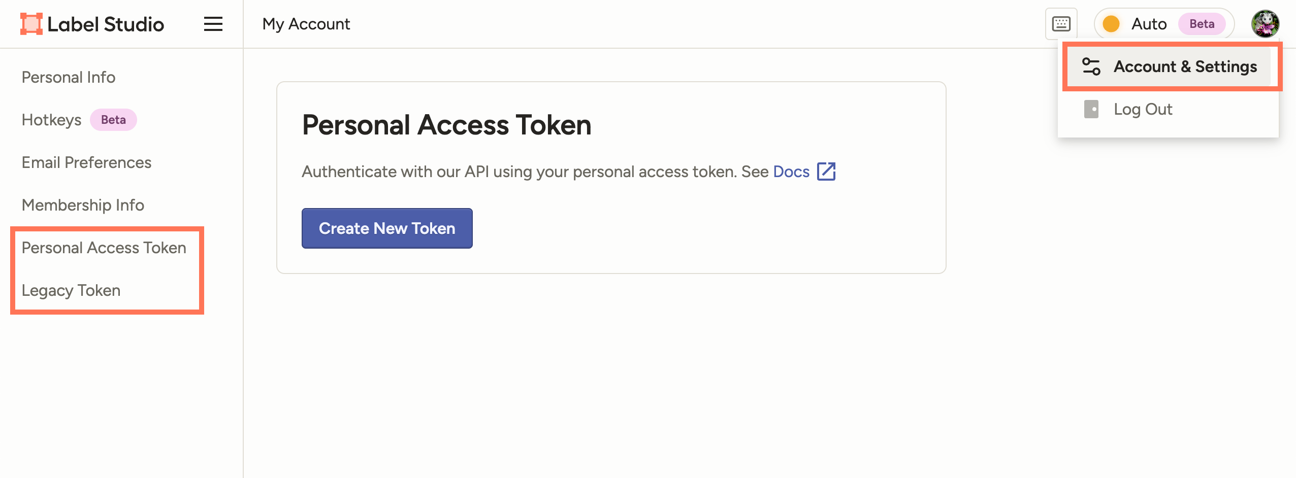 The first thing you will need is a Label Studio API token. As described in the documentation, we can use the UI to get a token for our user, as shown below.