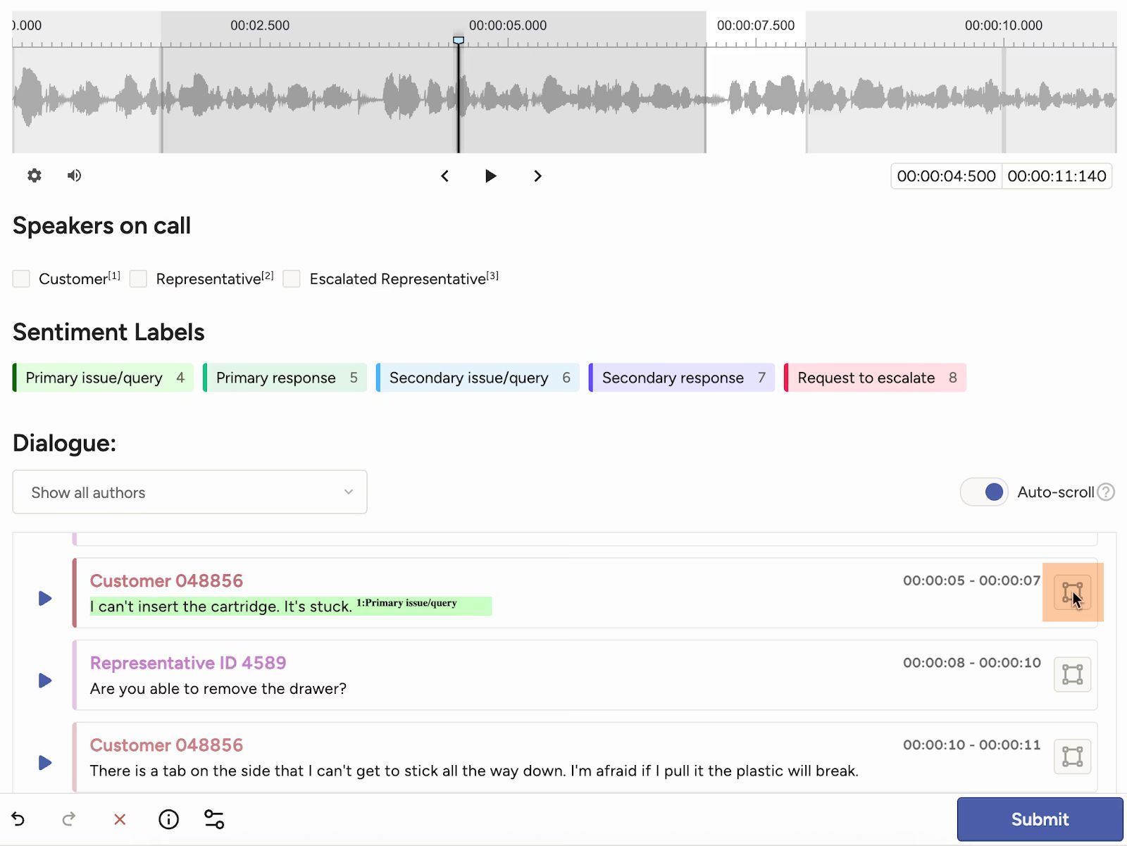 For dialogue-structured audio transcripts, you can now label entire utterances with one click or a single keyboard shortcut, no more dragging across text spans.
