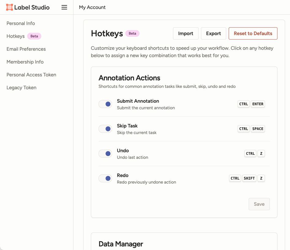 In healthcare projects where teams review clinical transcripts, annotators often need to apply the same labels repeatedly, marking utterances that describe symptoms, medications, or diagnoses. With hotkeys mapped to those actions, you can move through transcripts without ever reaching for your mouse or shifting your hands on the keyboard. Shaving even a few seconds off each annotation adds up to a huge efficiency gain when you’re working across thousands of records, while also ensuring consistent, repeatable results.
