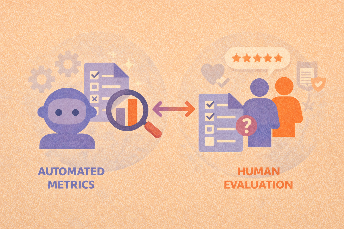 Automated metrics keep evaluation consistent at scale. Human evaluation captures the nuance that metrics miss. The most reliable evaluation workflows assign each a clear role: automation for repeatability, humans for judgment, and a structured process for reconciling disagreements between the two.